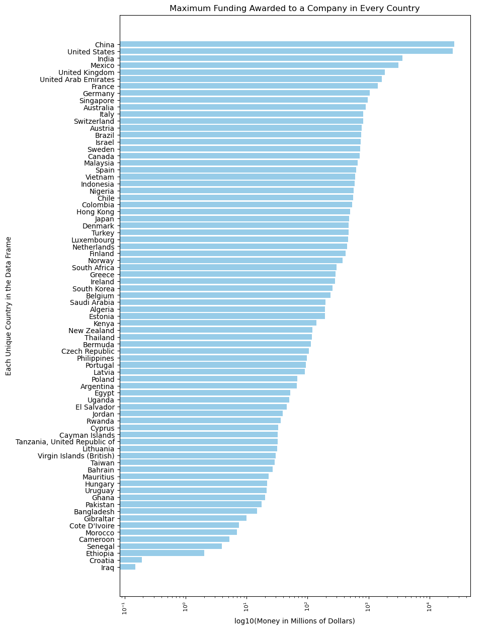 This graph illustrates the maximum amount of funding an individual company receives in each country. This will be vital to our analysis because we can predict if a company will receive more funding based on the country, they founded their company in.
