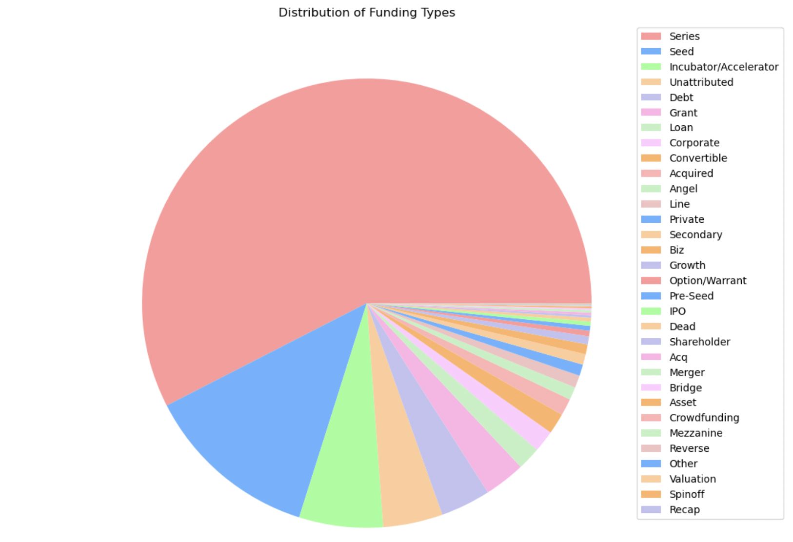 This pie chart illustrates the last funding type an individual company received. This information will be important for our analysis because we can predict the success of a company based on the type of funding that they receive.