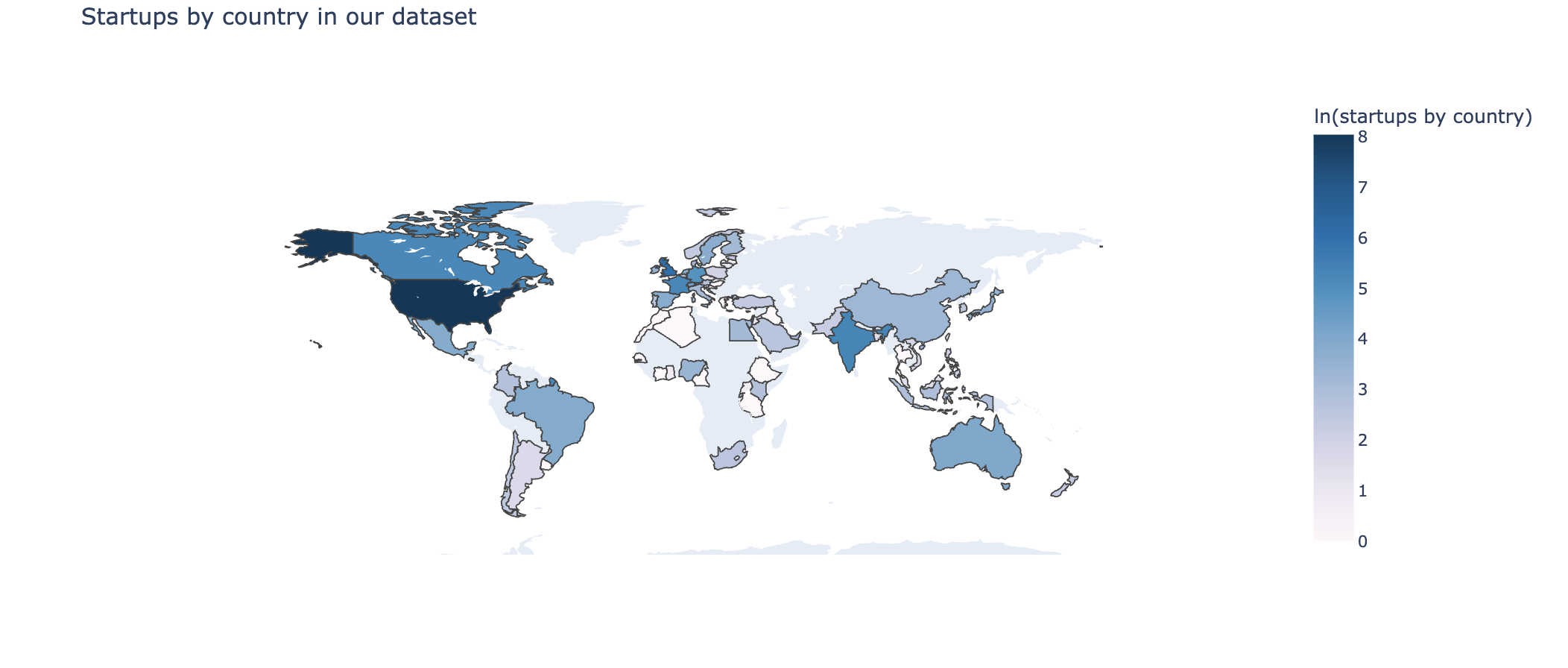 We have the country information for each of our startups, so we can plot a map showing how many startups are in each country in our dataset. From this plot, we get an idea of where the startups we are analyzing are located, and we can also decide if there are countries we want to drop or countries we want to gather more data for.