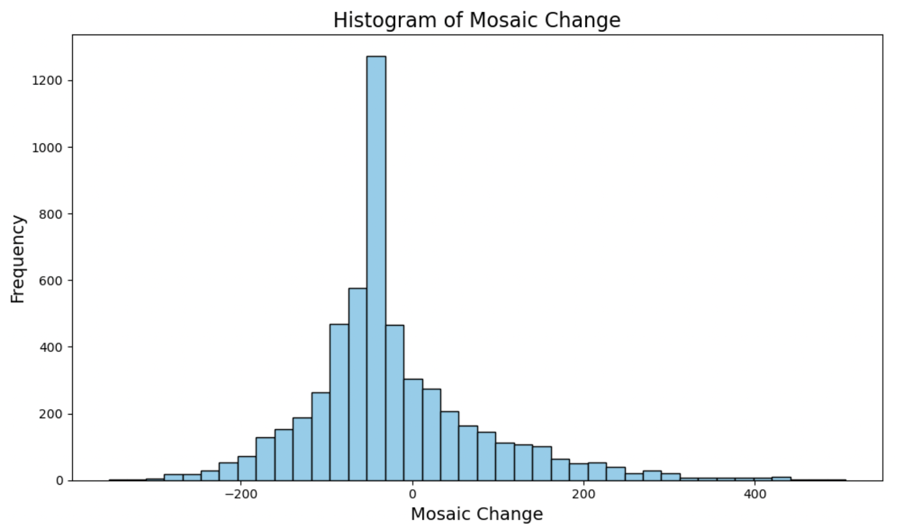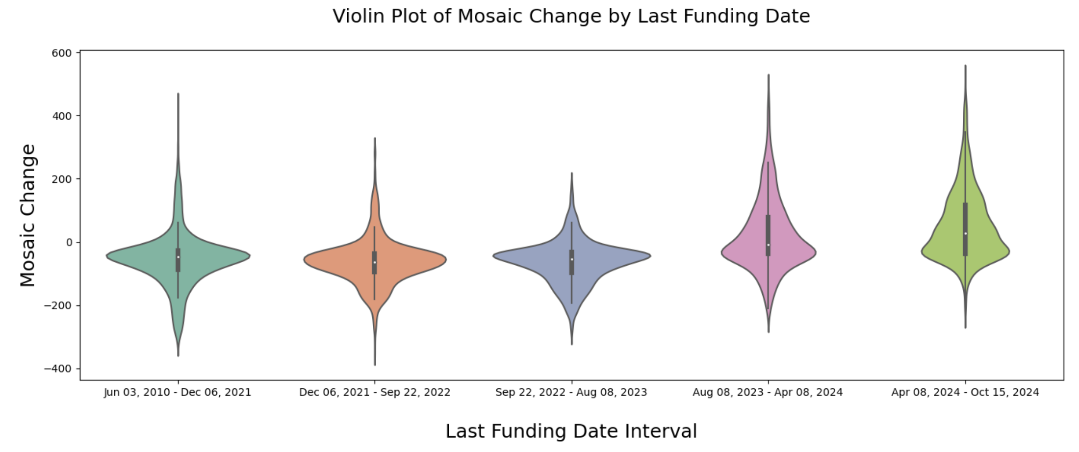 The mosaic score for a company is an internal metric designed by CB Insights for evaluating the long-term success of startups. Without a paid account, only the mosaic score change was available to scrape for each startup. This plot puts startups into bins based on their most recent funding date, then creates a violin plot for each bin to show the distribution of its mosaic score changes. From this plot, we can see that startups that have recently received funding tend to have more positive mosaic score changes. This intuitively makes sense: if a startup has not been funded for a long time, it is less likely to be a long-term success.