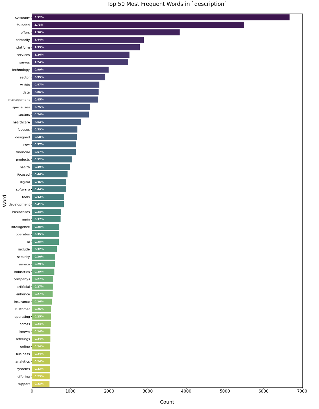 Each of the startups in our dataset has a description written by CB Insights. Using these descriptions, we can extract the most common words and create a frequency plot. Some of the descriptions contain city names, so we are getting common city names and removing them from the descriptions before processing the words. We are also moving stopping words like 'the', 'and', and 'but'. From this frequency plot, we can get an idea of what types of companies we are looking at, and what the most popular areas are.