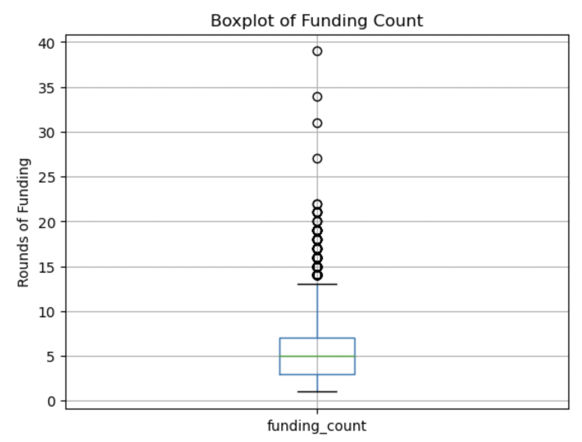 This boxplot shows a heavy right skew, but a symmetrical middle 50% of the data, with a median of 5 (close to the mean) of the number of rounds of funding. There are high outliers but less outliers than in previous boxplots.