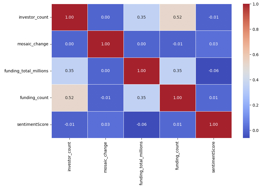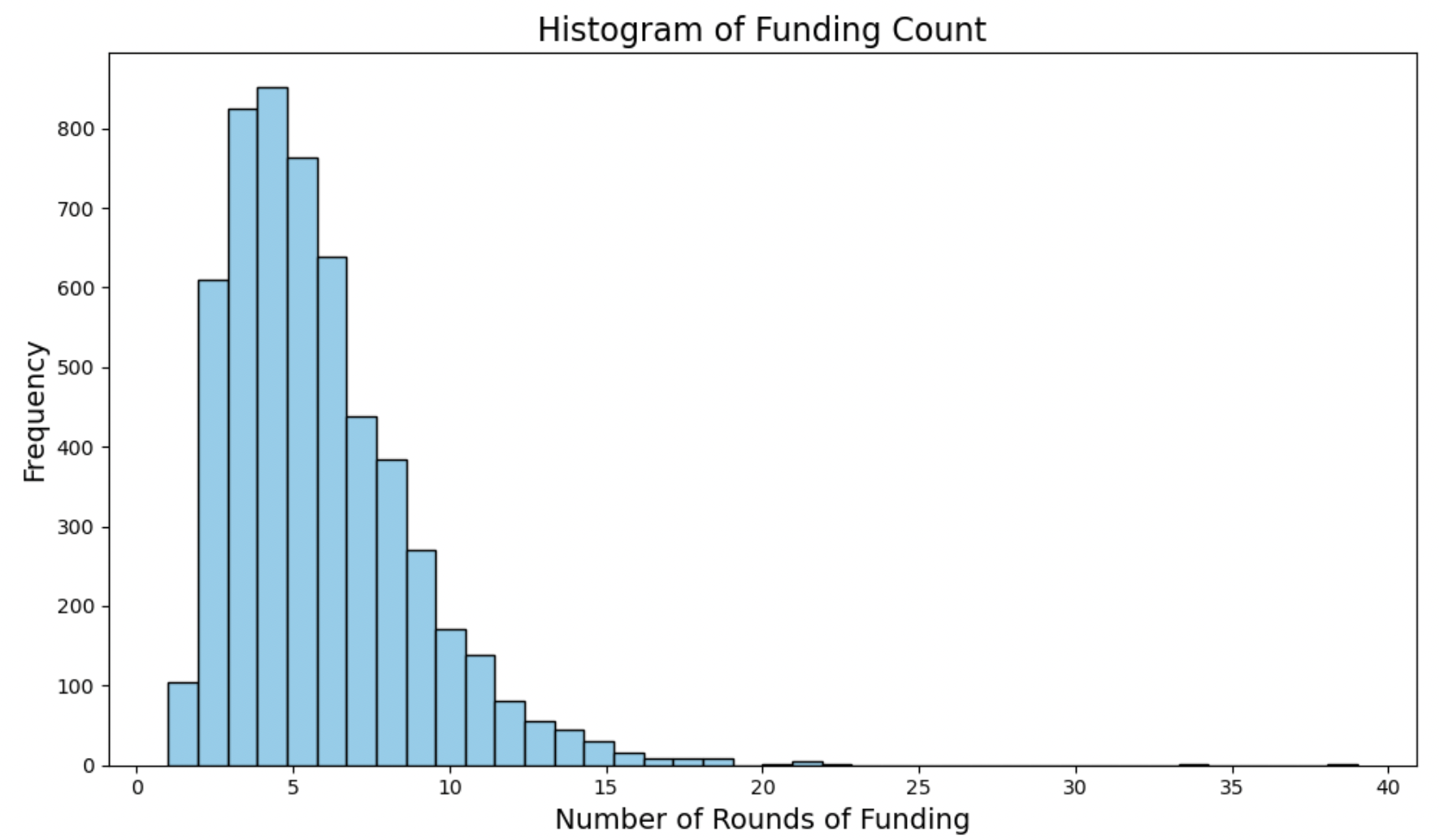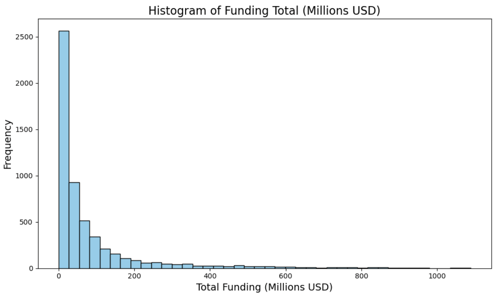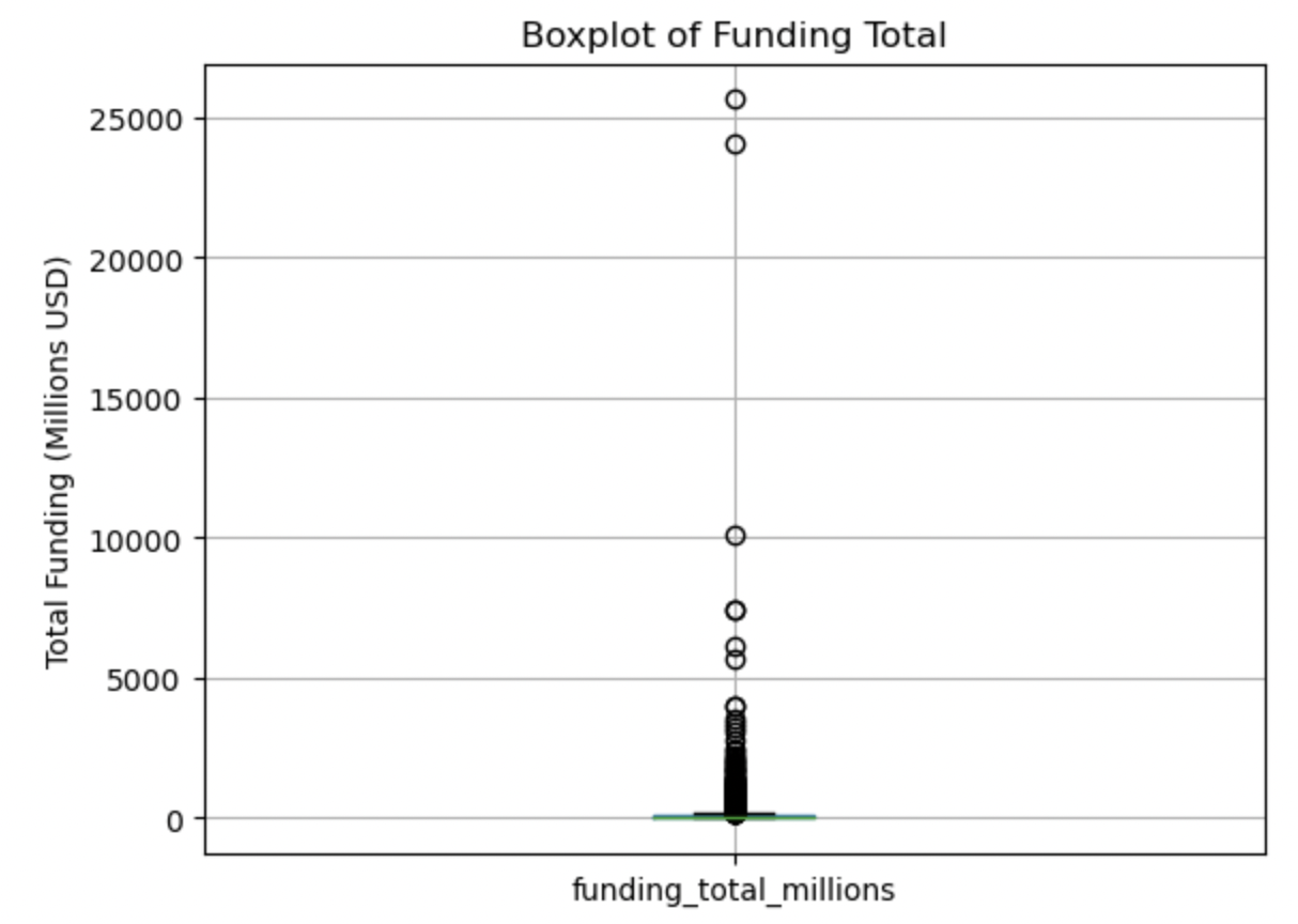 This heatmap shows color-coded correlation coefficients between each numerical variable, with a stronger correlation being the reddest, and the weakest being the bluest. We immediately notice how most of the heatmap is very blue, with almost no correlation between most variables (with extremely small coefficients, a few even being 0). We see a moderate positive correlation between funding count and investor count, and a weak positive correlation between total funding and funding count and total funding and investor count. But most variables appear to be as uncorrelated as possible. Again, this will prove to be a problem for further model-building and analysis, and we may need to explore other sources of data to create effective models.