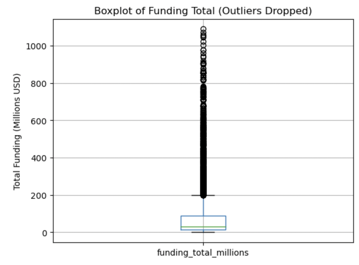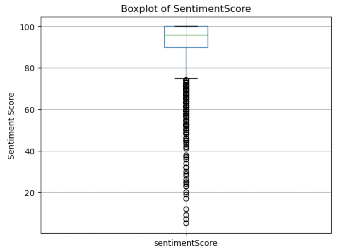 After sentiment scores were extracted, summary statistics were generated and this boxplot was created. We see a very high mean of around 92, indicating that most sentiment scores are very high. This is likely due to bias in selecting startups that were able to gain high amounts of funding (with a mean of 114 million USD). This boxplot shows most of the data being very close to 100. There is a strong left skew to this data and plentiful low outliers.