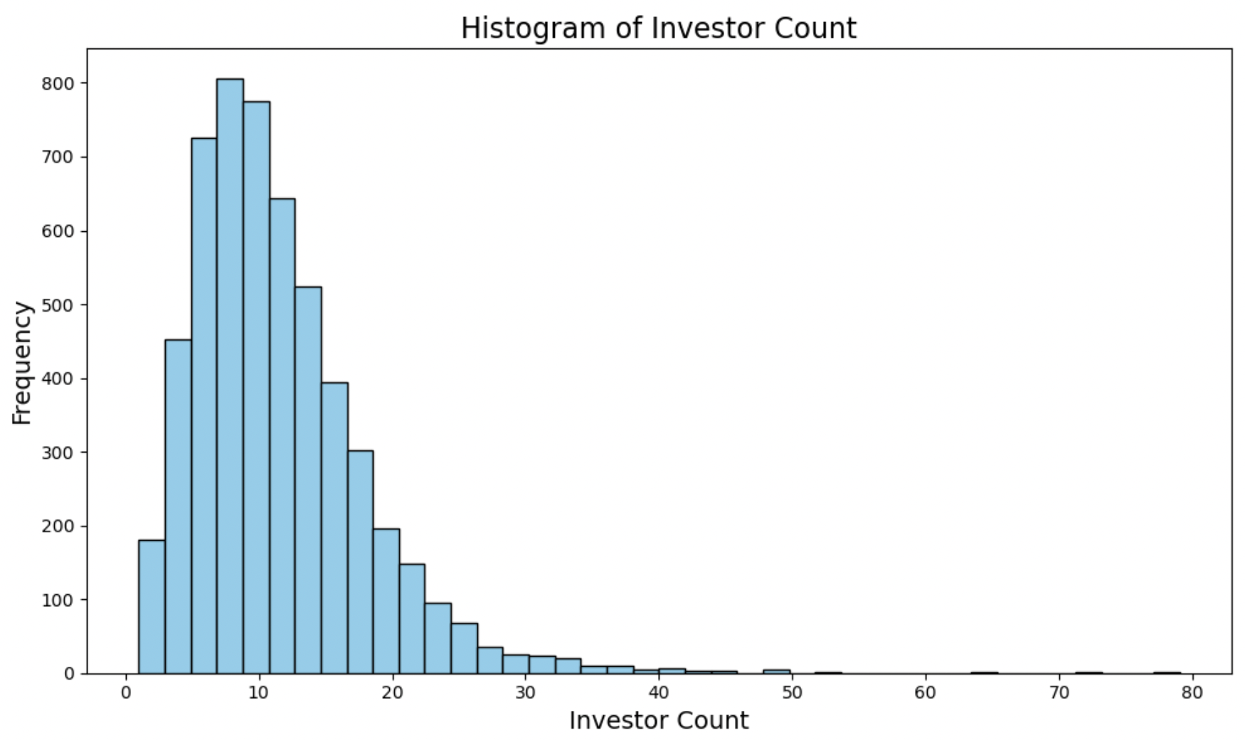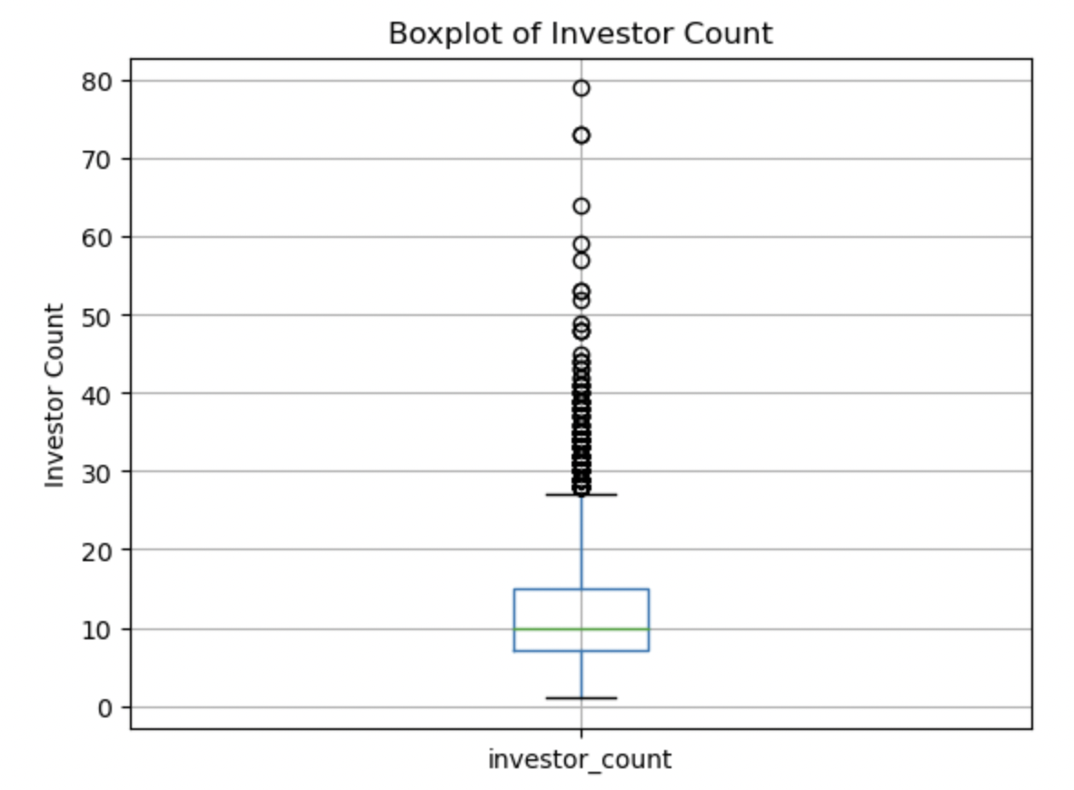 This boxplot shows a median of 10 investors, with the middle 50% of the data lying close to the median, a low whisker of 1 and a high whisker a bit higer than 25. The data appears somewhat symmetrically spread with a bit of a right skew towards higher numbers of investors, and a significant number of high outliers.