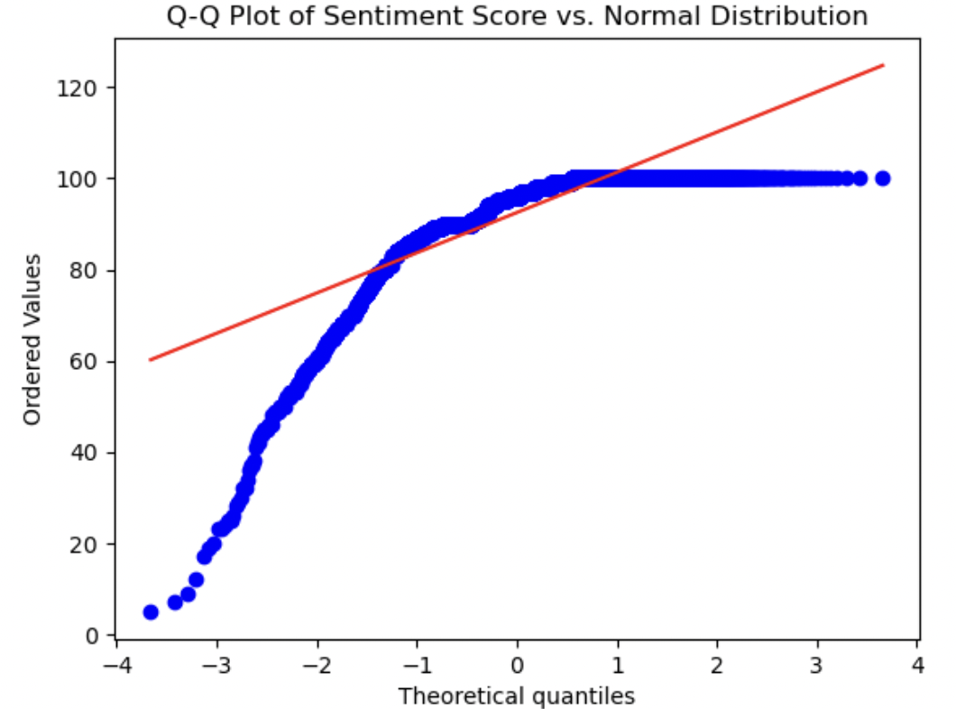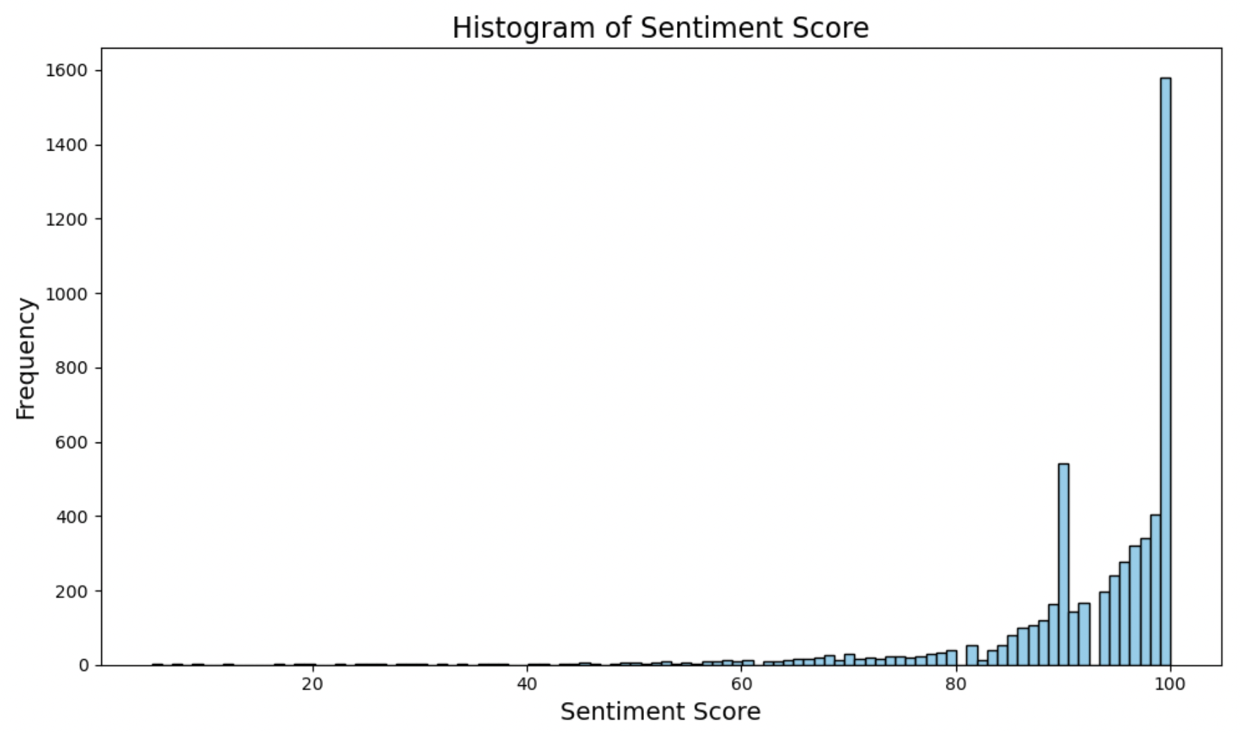 This histogram shows that most sentiment scores are 100, with a very long left-handed tail. The mean is close to the median even with so many outliers, indicating how many values are directly at 100. It may be worth further investigation to find out how sentiment score is determined and if it has much meaning to our analysis.