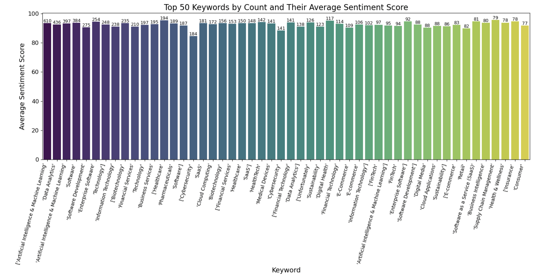 To understand more about how keywords may have influenced sentiment analysis, we created a separate dataframe that aggregated the average sentiment value score for each industry keyword present in the dataset. We iteratively updated the average sentiment score for each keyword as it was encountered in the dataset, and also counted the instances of each keyword present. This graph shows the average sentiment score for each industry keyword and the number of each keyword present in the dataset. We do not see hardly any variation here. This is likely a good indication that our dataset is fairly biased, either in the way that sentiment scores are calculated, or in the fact that every startup in the dataset is very successful, having been able to secure 114 million dollars of funding on average, so it is likely that these industry buzzwords associated with the industry of each startup all are attached to very positive sentiments.