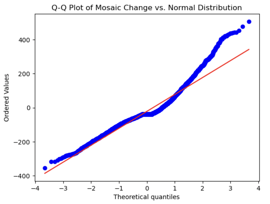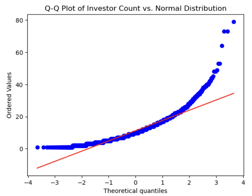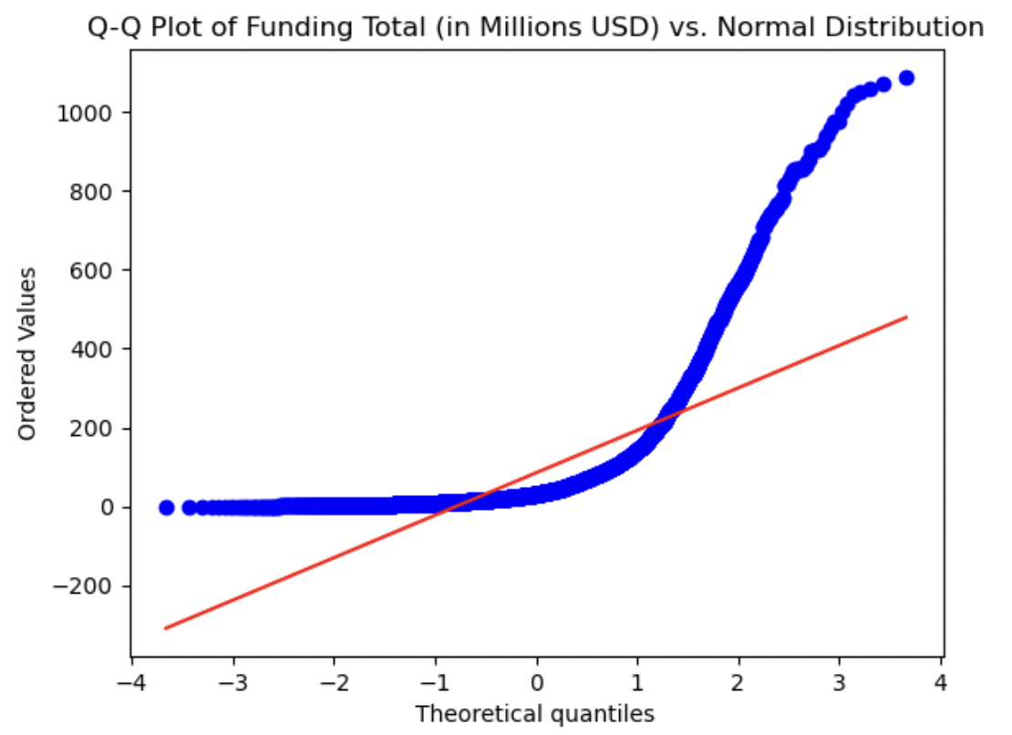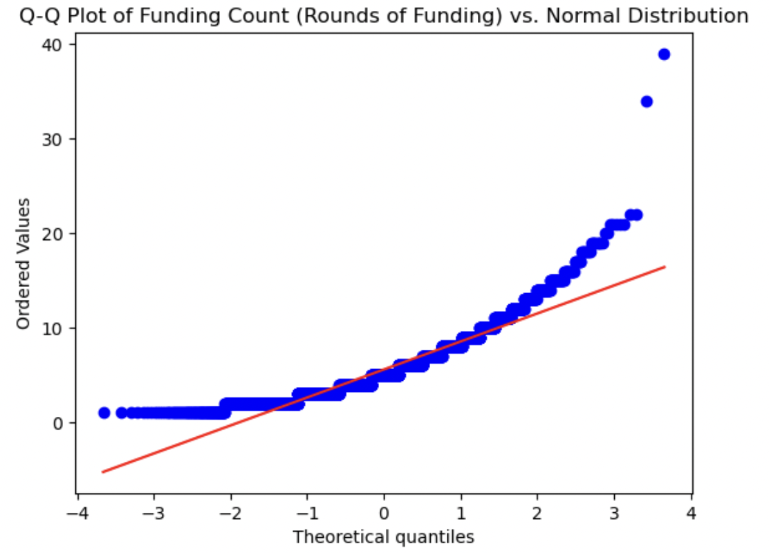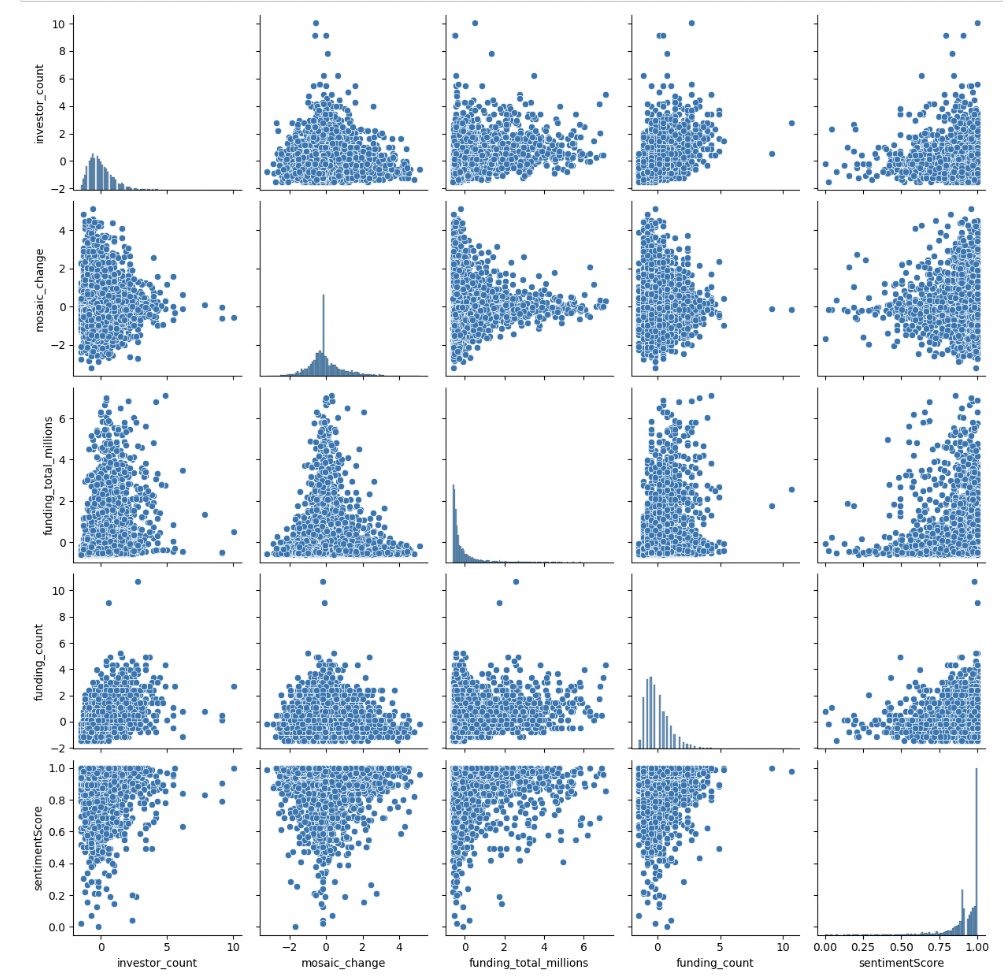 QQ-plots were created for each relevant numerical variable to visually determine how normally distributed they were. We can visually measure how close the distribution of each numerical variable is to the theoretical Normal distribution by how closely they approximate the straight red line in each plot. Each variable shows a marked difference between its distribution and a normal distribution. The Mosaic score is the most normally distributed variable, as it is the closest to the straight line. Both Funding Total and Sentiment Score show the most significant deviations, as we have seen already in above plots - both of these variables had peaks at one end of their value ranges or the other. Investor Count and Funding Count showed distributions in between these two aforementioned plots, not being completely normally distributed by any means, but closer than Funding Total and/or Sentiment Score. The deviation from a Gaussian distribution for each variable indicates that normalization may be worthwhile for all numerical variables.